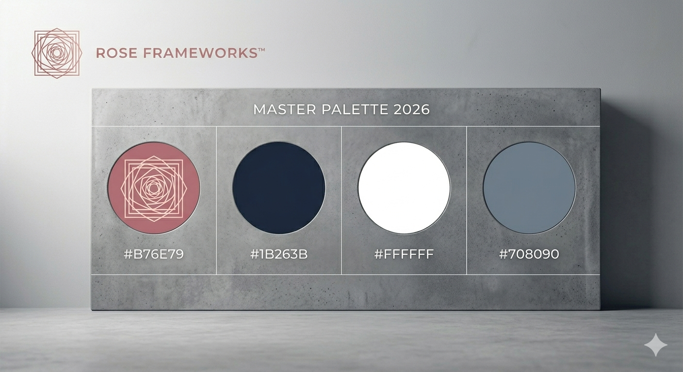 Our palette is engineered for silent luxury, balancing the weight of our foundations (grey/navy) with the kinetic energy of our innovations (rose gold).